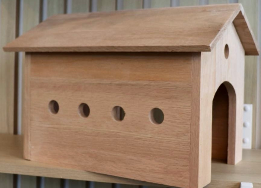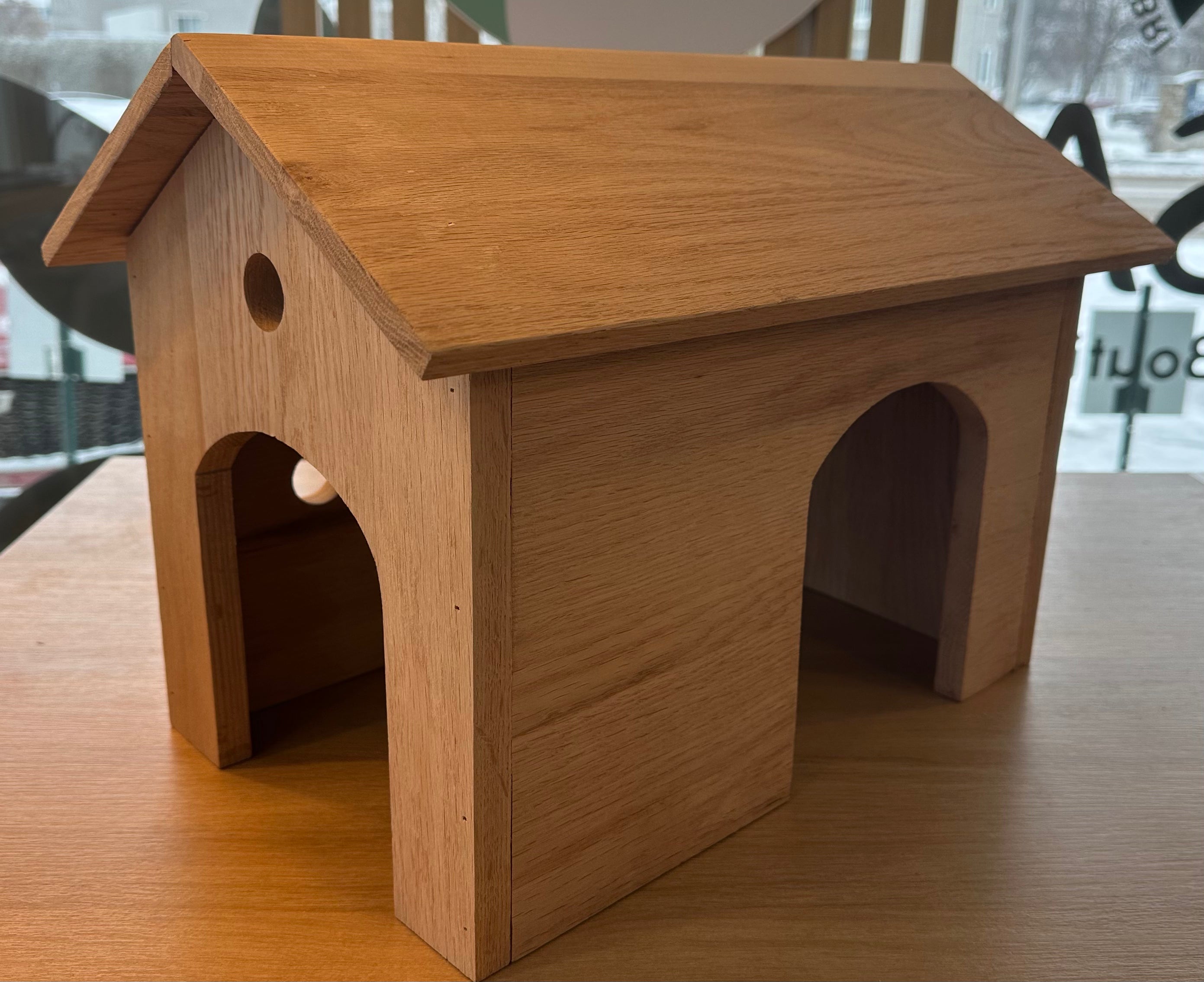 Une maison-tunnel en chêne fabriqué par un artisan local. Deux portes pour votre lapin. S’insère dans votre décor facilement.