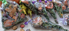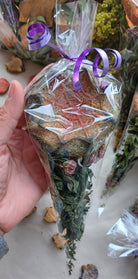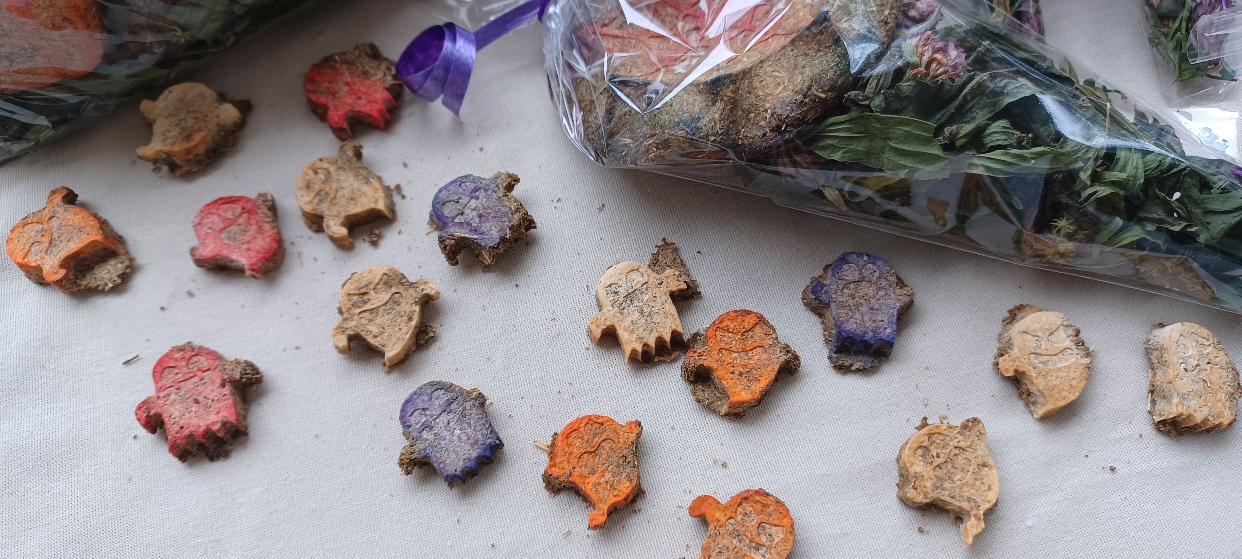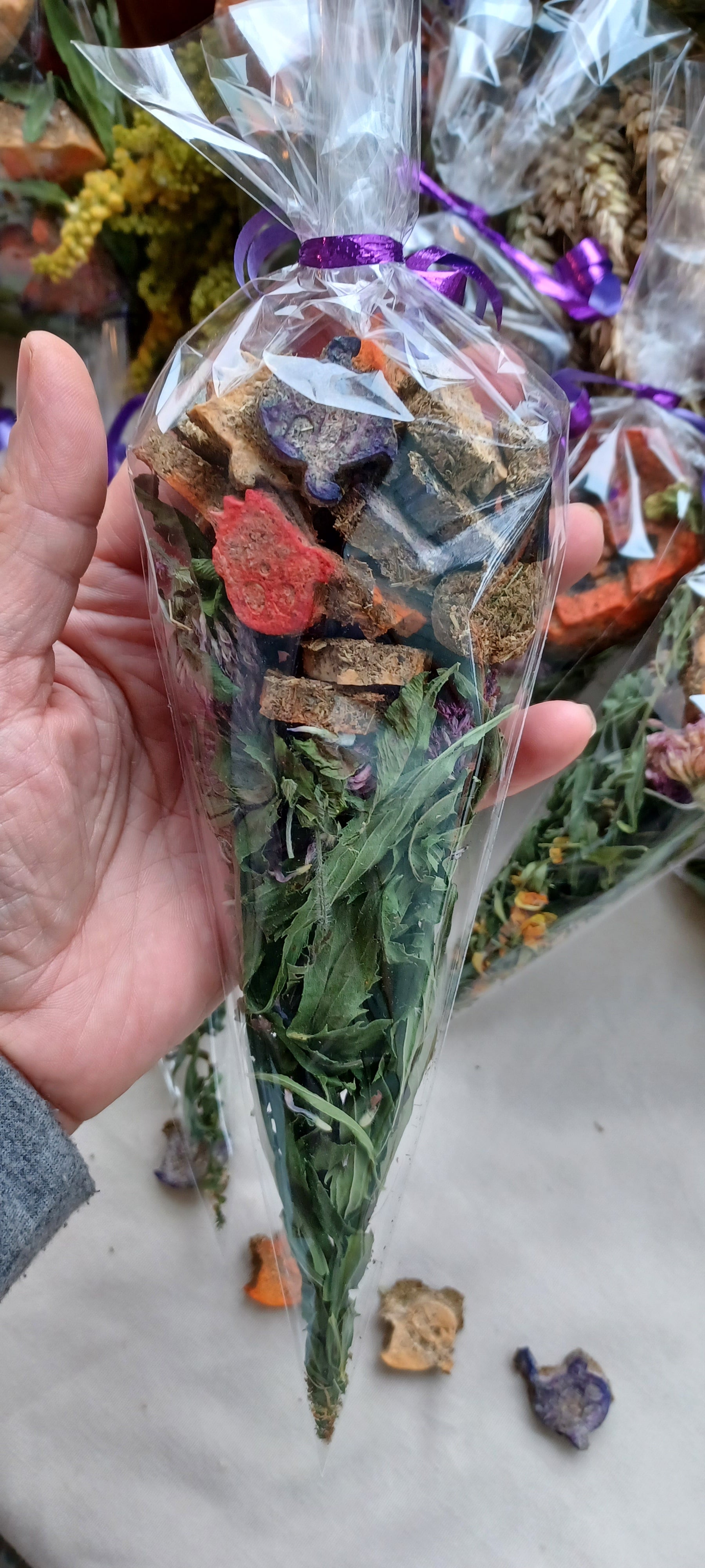 Ils contiennent environ 30 à 32g de friandises en forme de fantômes assortis ou encore une grosse friandise en forme de toile d'araignée ! Au total, environ 35 à 36 g par cône. Les herbes sont des feuilles de verge d'orge et des fleurs de trèfle rouge. Tout cela est enveloppé avec un joli ruban ! Un beau petit cadeau d'automne à offrir !!!