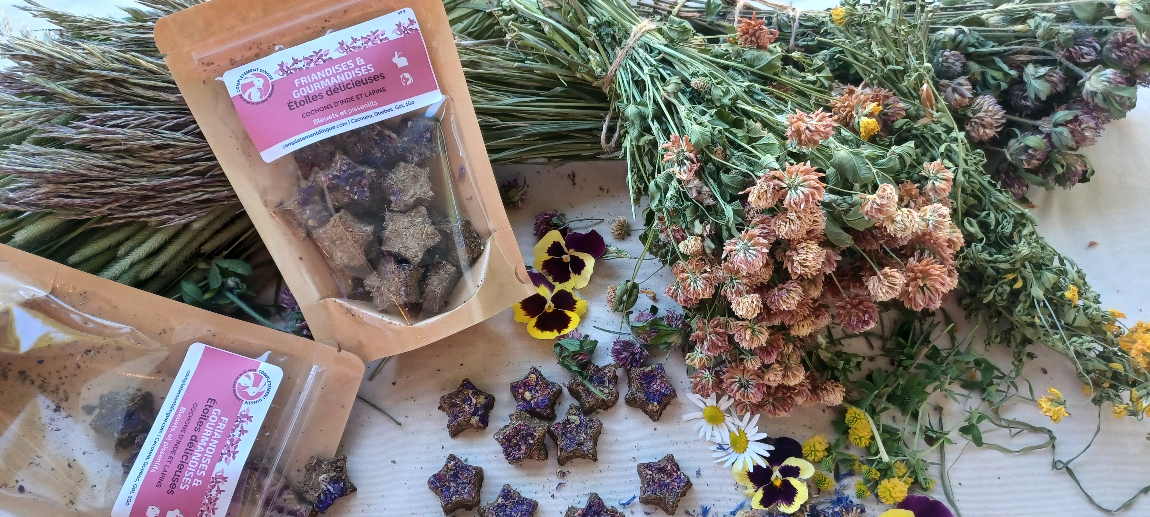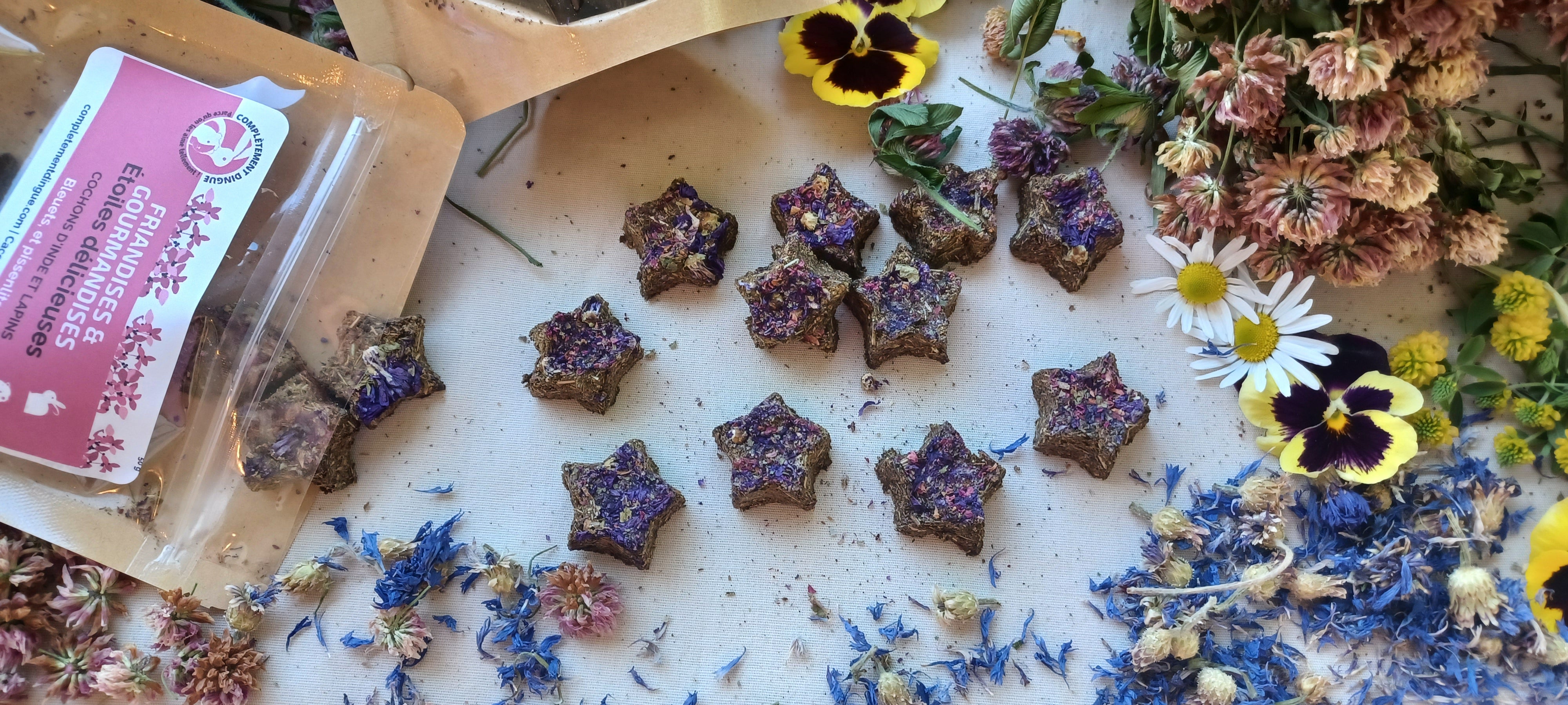 L'ajout de fleurs complète harmonieusement la recette. Elles ajoutent non seulement de la couleur à la ration, mais surtout, elles apportent tous les bienfaits par les plantes. C'est une belle façon d'introduire les fleurs dans l'alimentation qui permet aux rongeurs de varier son alimentation pour lui apporter des vitamines, antioxydants tout en se rapprochant de sont alimentation naturelle.