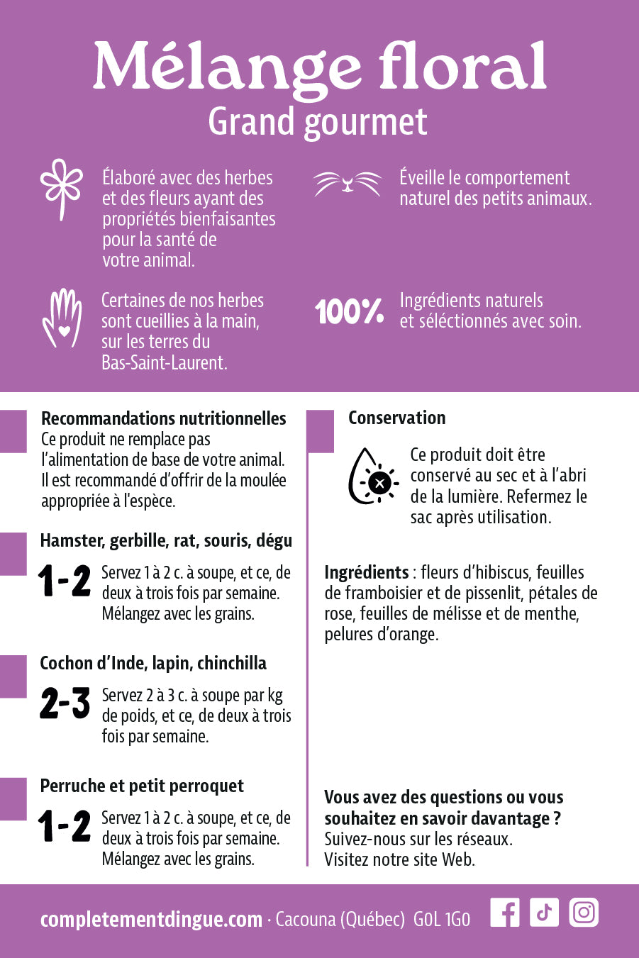 RECOMMANDATIONS : Vous pouvez en ajouter dans le foin pour encourager votre animal à fouiner ou bien les cacher dans un tapis de fouille pour faire de l'enrichissement. Ces herbes peuvent également être ajoutées avec la moulée.