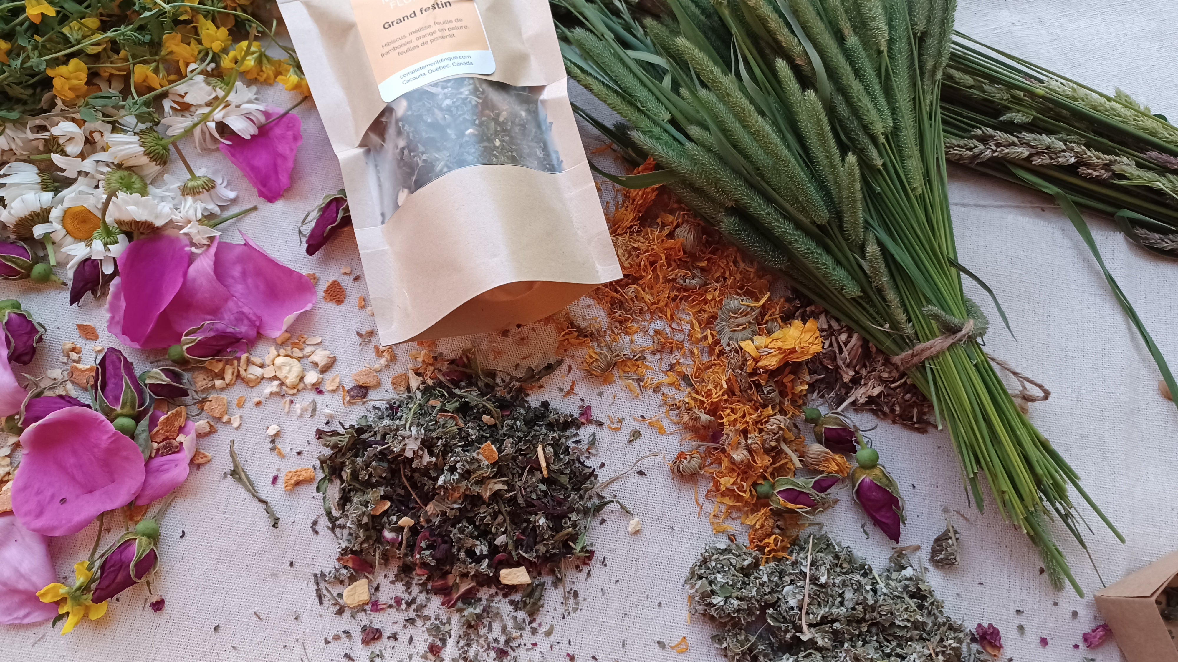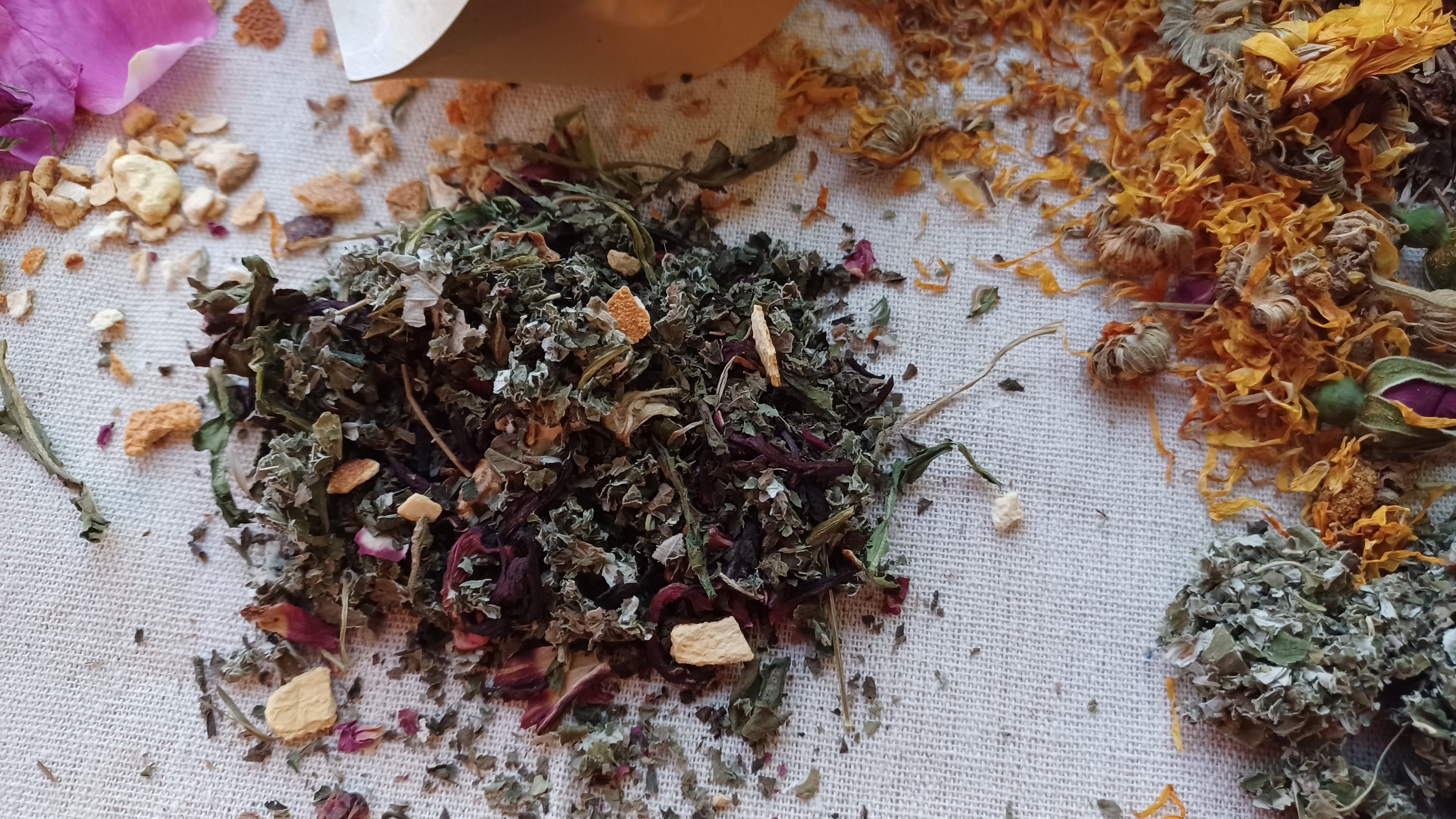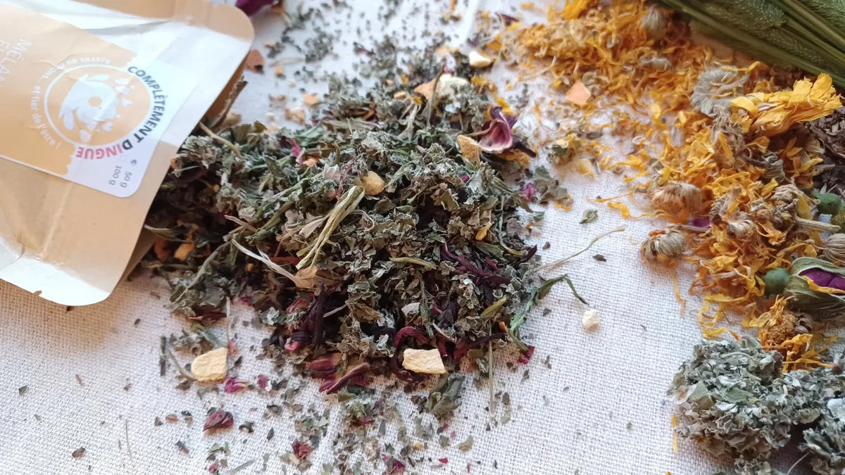 INGRÉDIENTS : Hibiscus, mélisse, feuilles de framboisiers, menthe, feuilles de pissenlits, pétales de rose et pelure d'oranges.