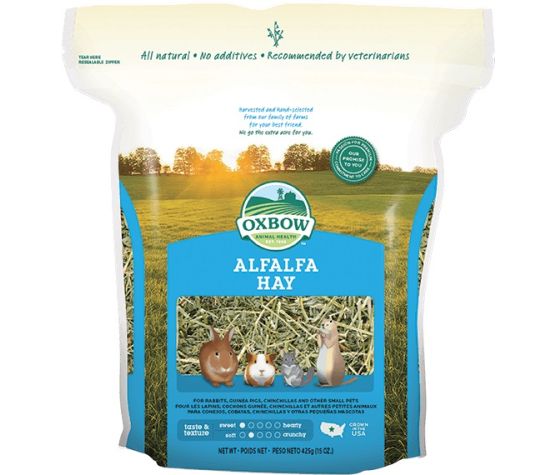 La luzerne est une légumineuse qui contient plus de protéines, d’énergie digestible et de calcium que le foin de graminées. Ce qui fait du foin de luzerne le choix parfait pour les lapins en croissance, les femelles en gestation.
