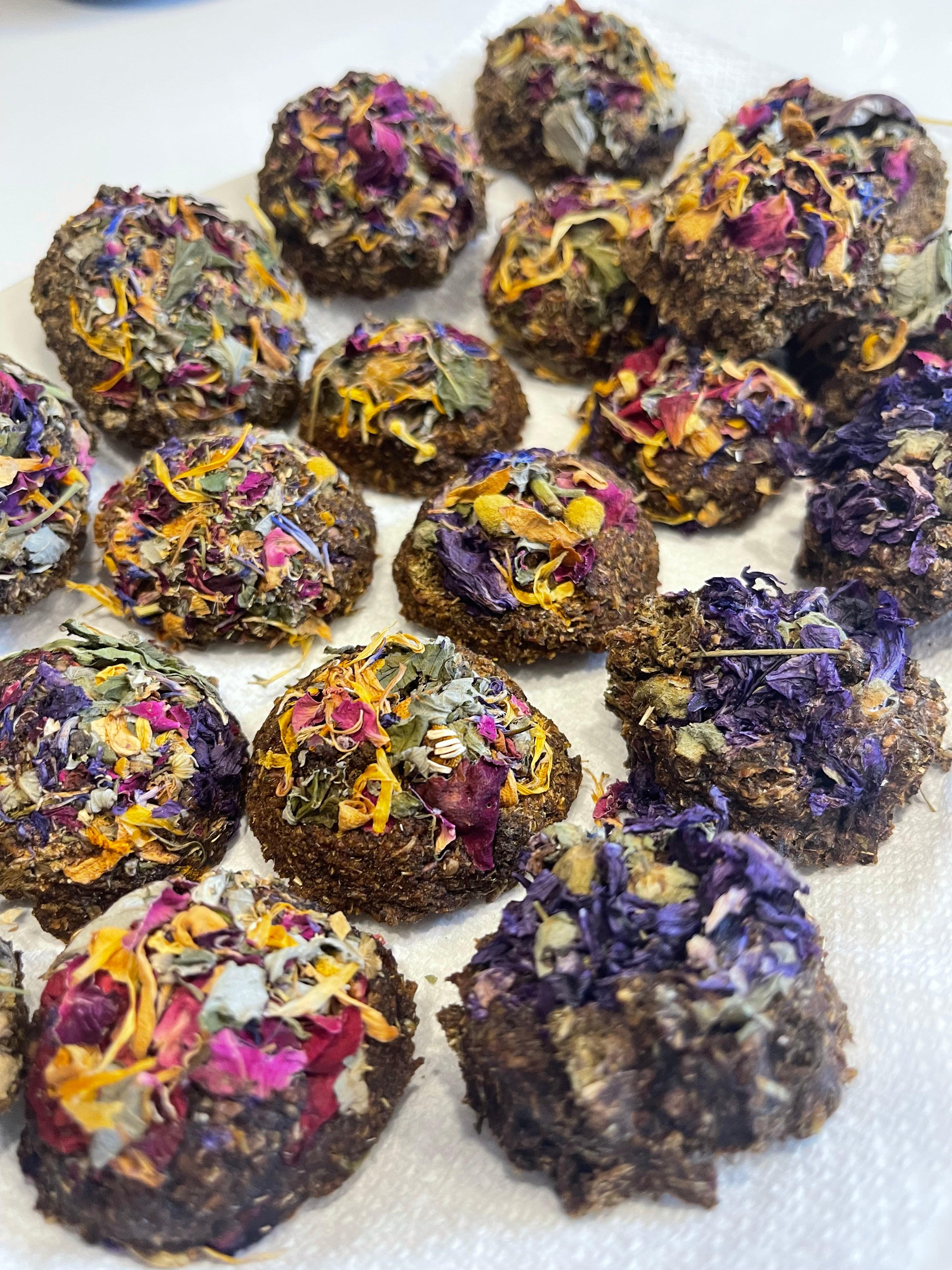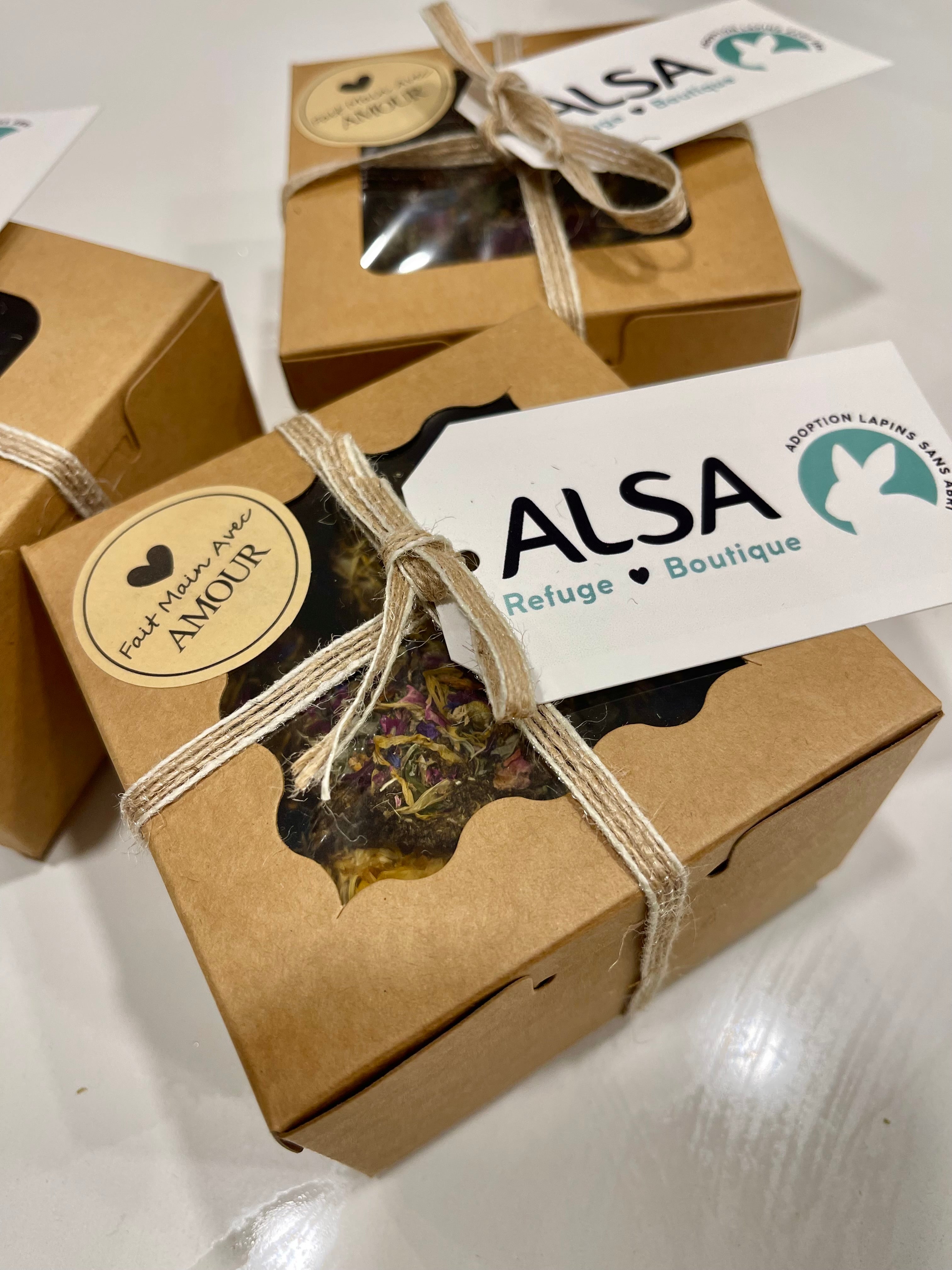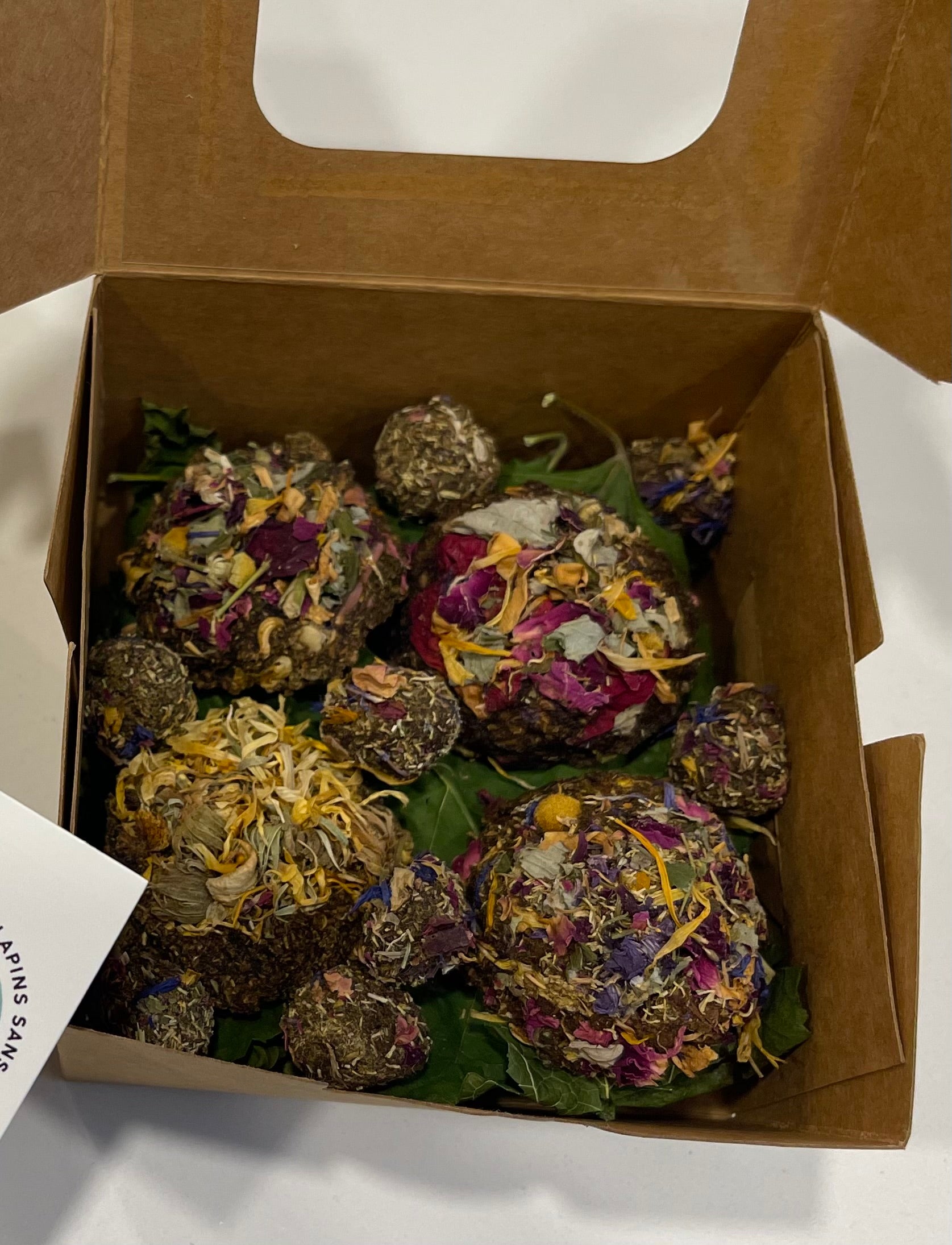 Faites au Québec, à la main de A à Z, avec des ingrédients d’ici ! Quoi de mieux ? Vous pouvez y retrouver nos biscuits maison et nos pépites fleuries, le tout déposé sur de belles feuilles de mûrier cueillies à la main.