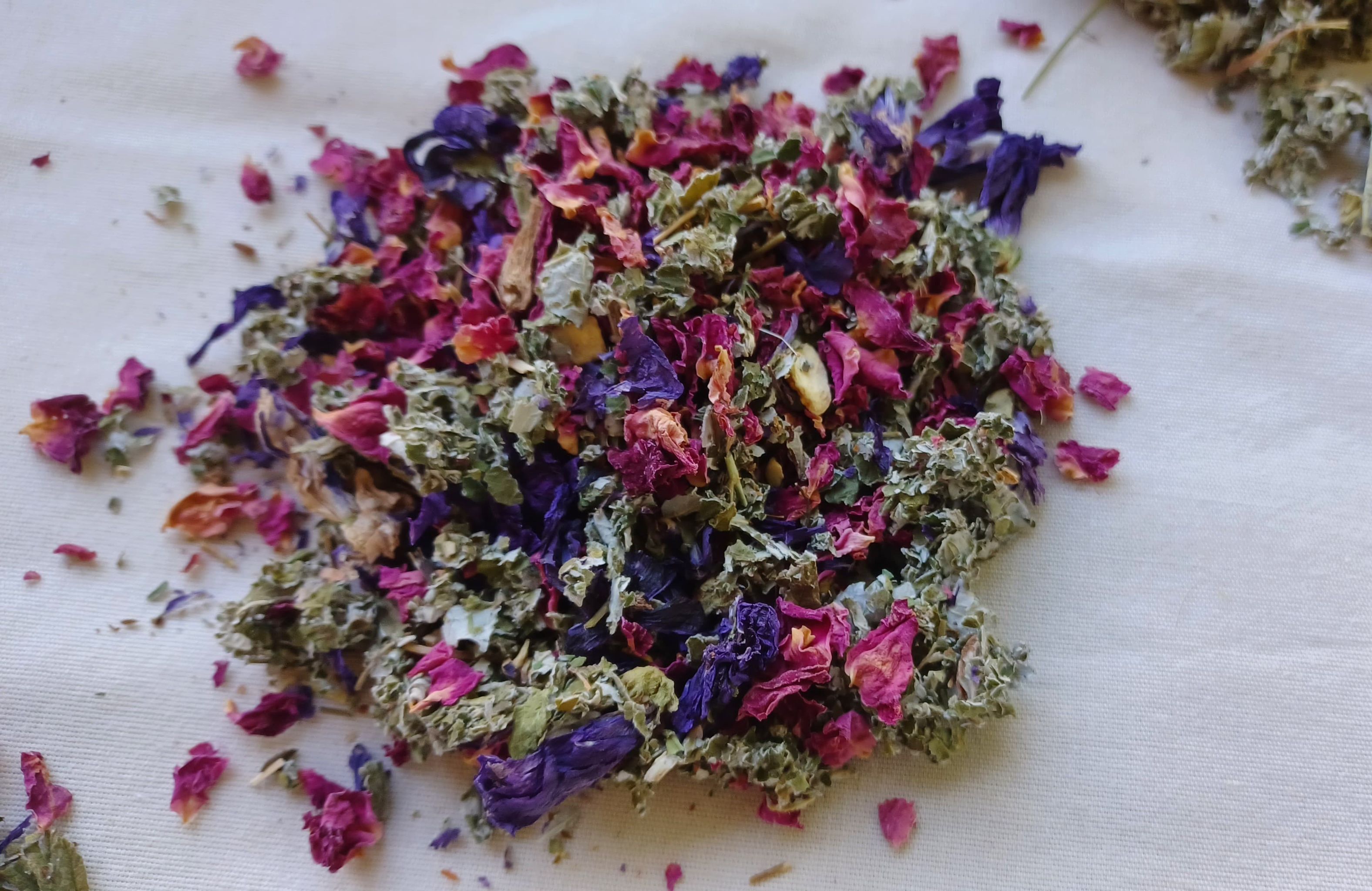 Ce mélange contient des fleurs de mauve, des feuilles de framboisier, de l'échinacée et de l'achillée millefeuille sans oublier les délicieuses pétales de rose ainsi qu'une petite touche sucré et vitaminé par des pelures d'orange. L'échinacée est reconnue pour ses propriétés immunitaires et les feuilles de framboisier sont riches en nutriments et vitamines.