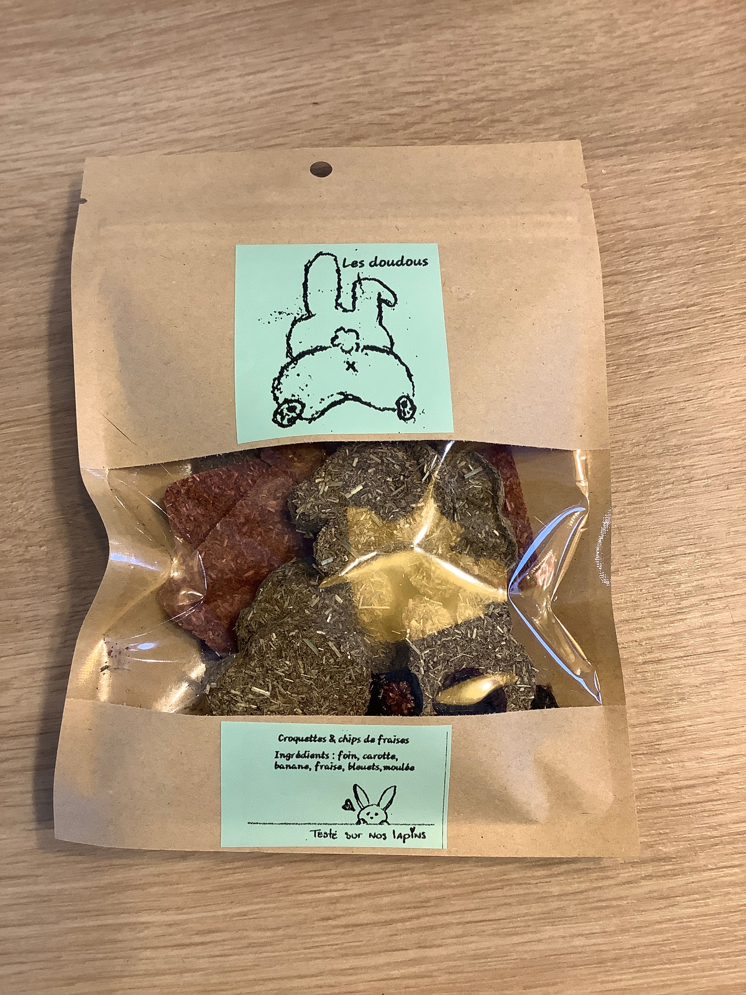 Ingredients : Foin, carottes, bananes, fraises, bleuets, moulée