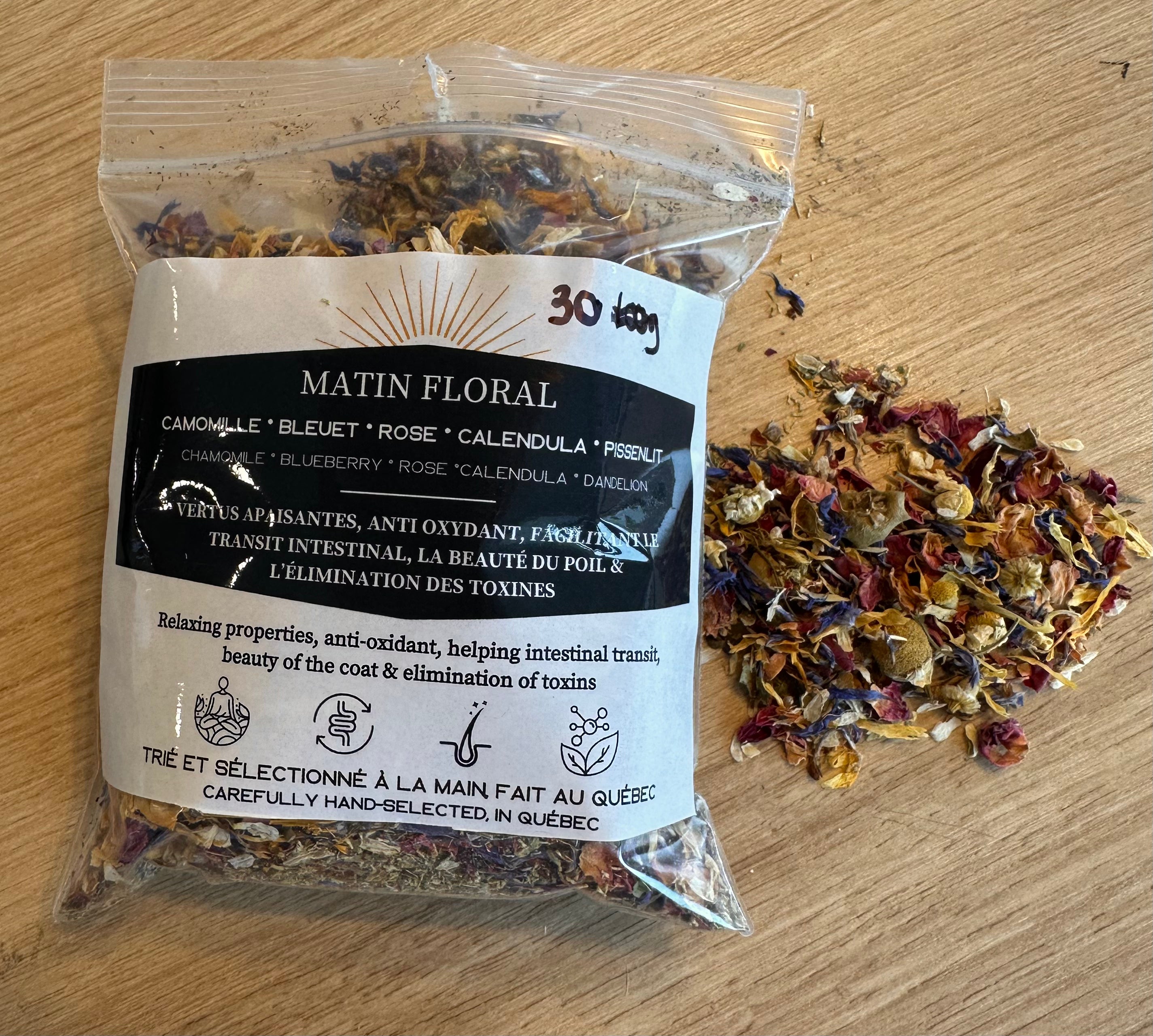 Un mélange floral qui ferait le bonheur de vos lapins. Composé de camomille, bleuet, rose, calendula et pissenlit.