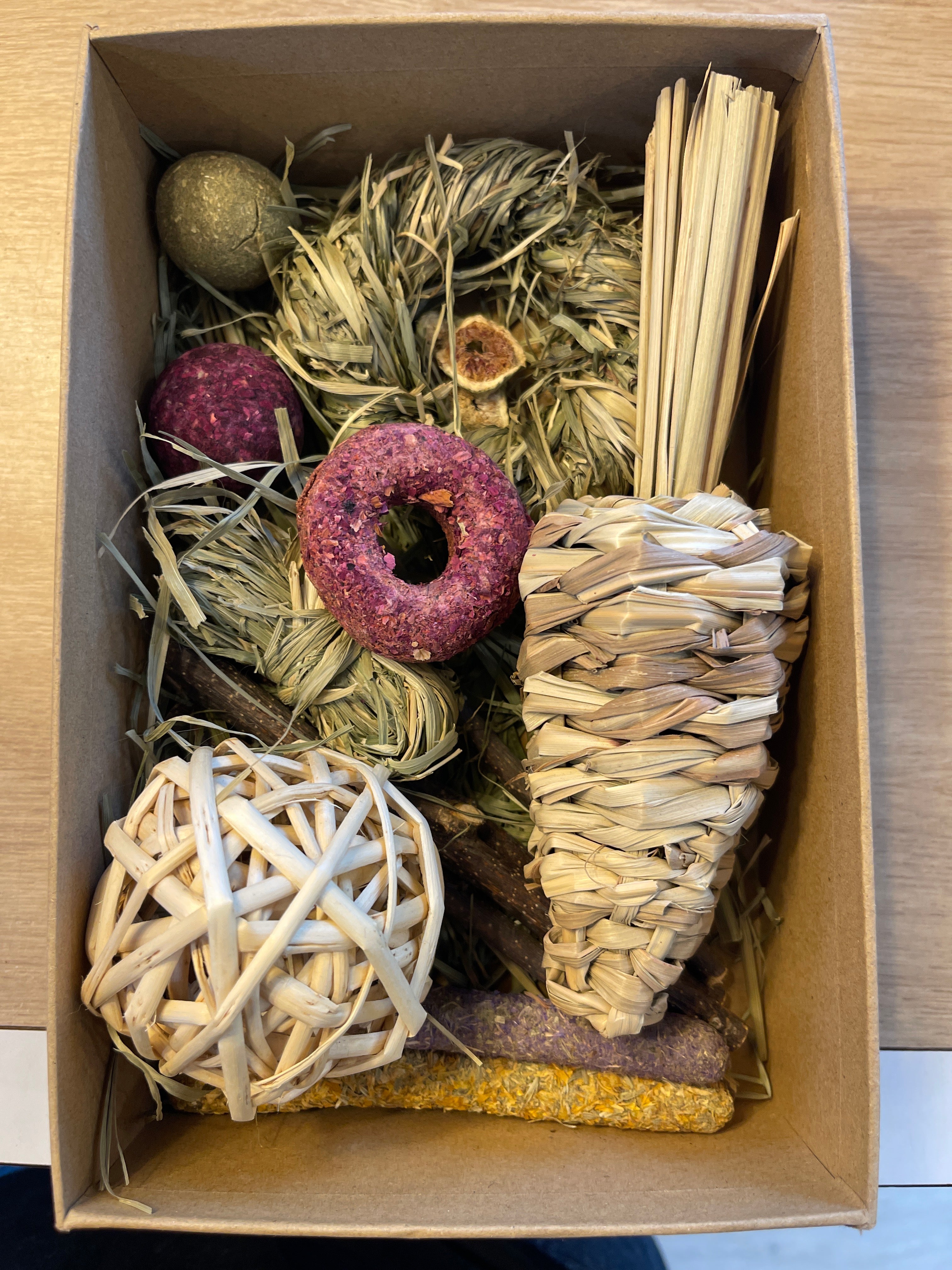 La boîte contient un ensemble de jouets et gâteries variés .