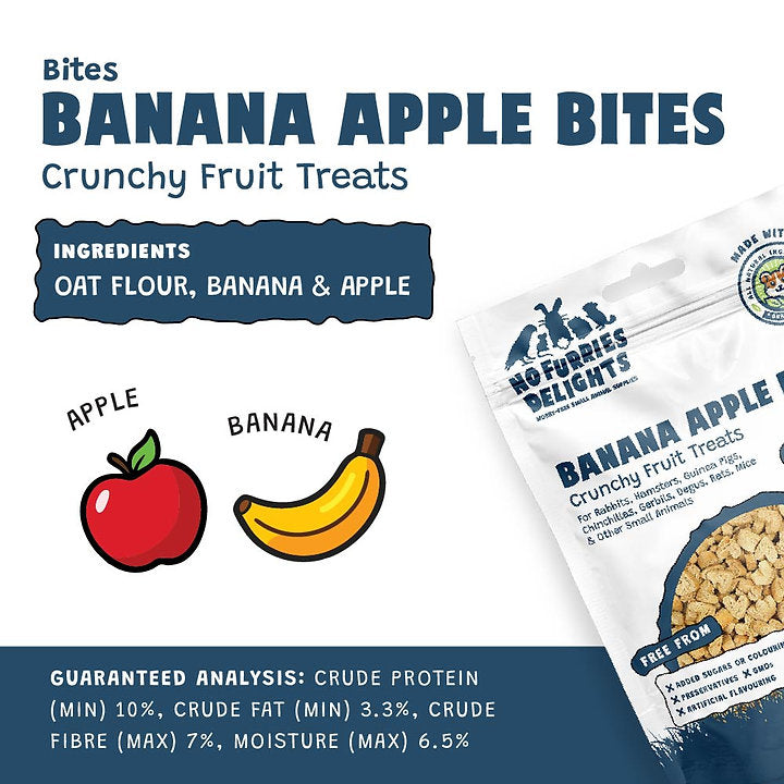 Quoi de mieux qu’une friandise avec l’une des saveurs préférées de votre petit animal ? Que diriez-vous de deux fruits favoris en une seule bouchée ! Nos Banana-Apple Bites sont un délicieux mélange de deux fruits adorés : banane et pomme.