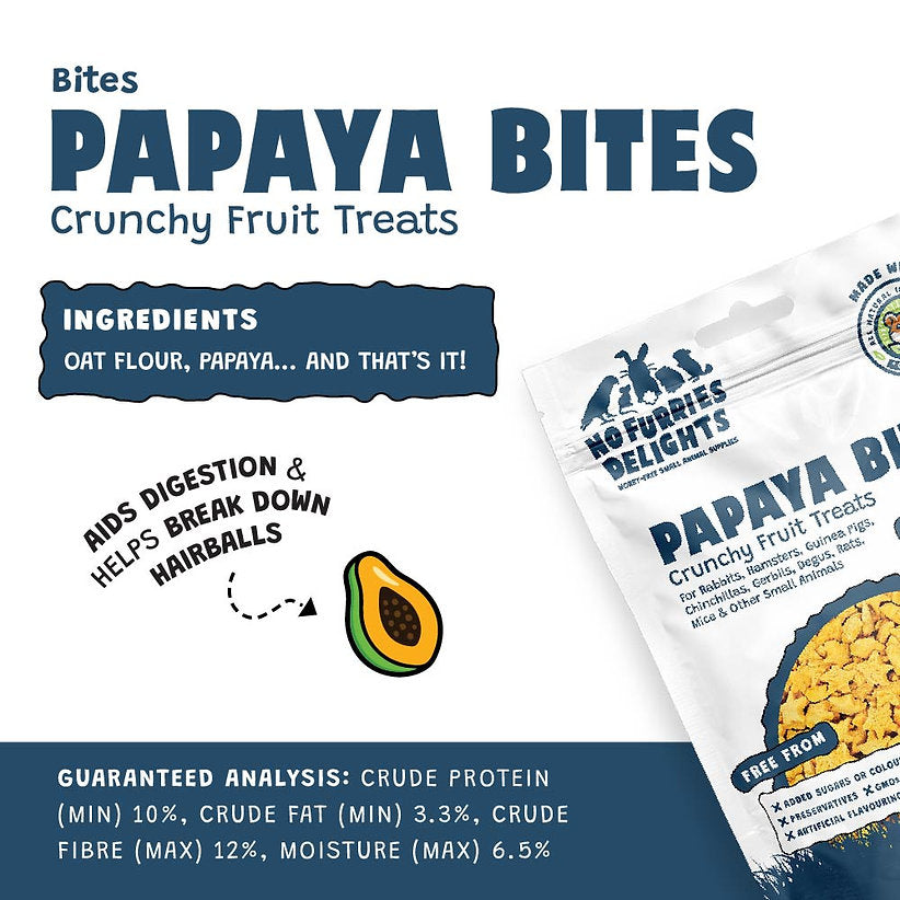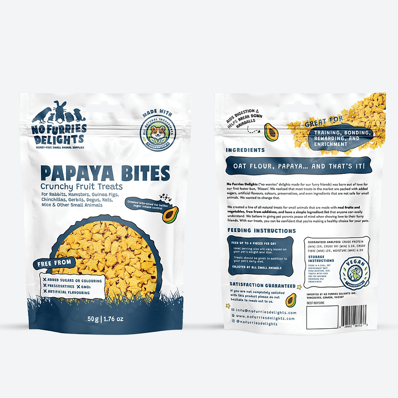 Nos Papaya Bites sont volontairement fabriquées en format bouchées pour vous aider à contrôler plus facilement les portions de sucre tout en vous permettant d’en offrir plus d’une. Elles sont parfaites pour l’entraînement, les récompenses et pour renforcer votre lien avec votre petit compagnon, rendant chaque moment de friandise encore plus spécial.