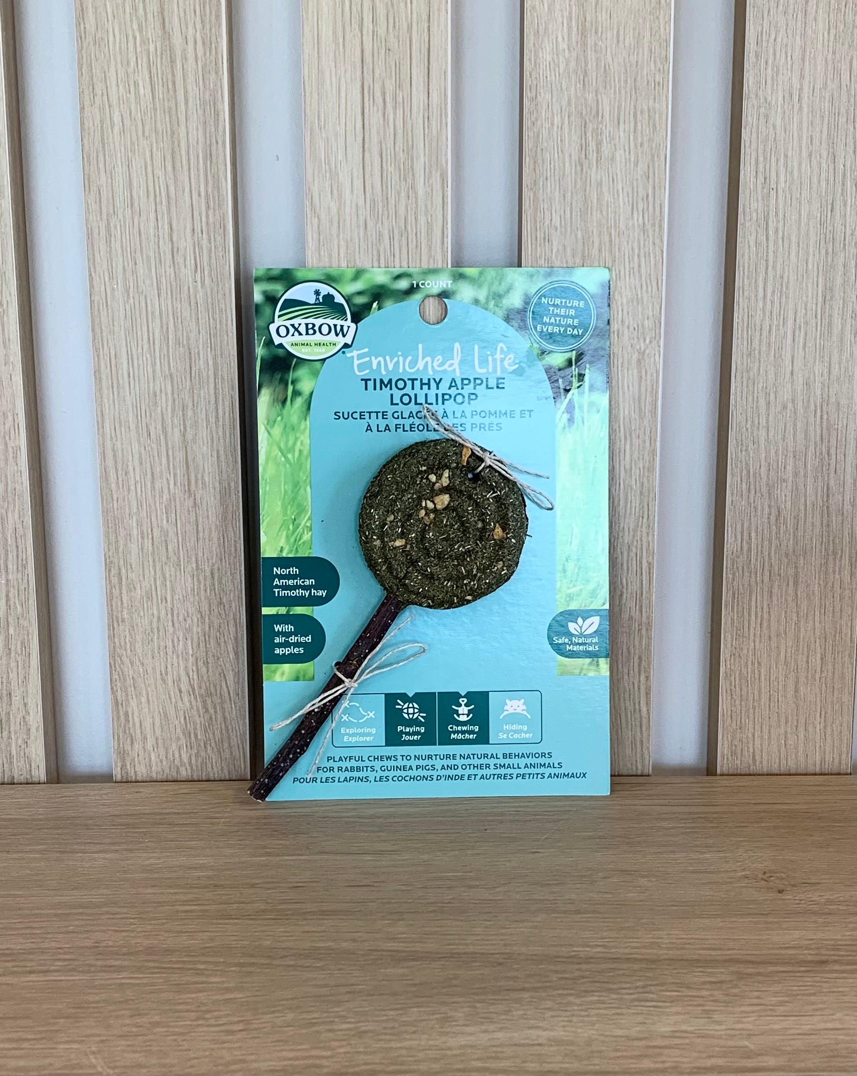 La sucette glacée à la pomme et à la fléole des prés pour lapins de Oxbow est délicieuse toute en étant à la fois stimulante. Le bâton est fait de bois de pommier non traité et de qualité, tandis que la gâterie elle-même est fait de foin de fléole des prés et contient de petits morceaux succulents de pomme.