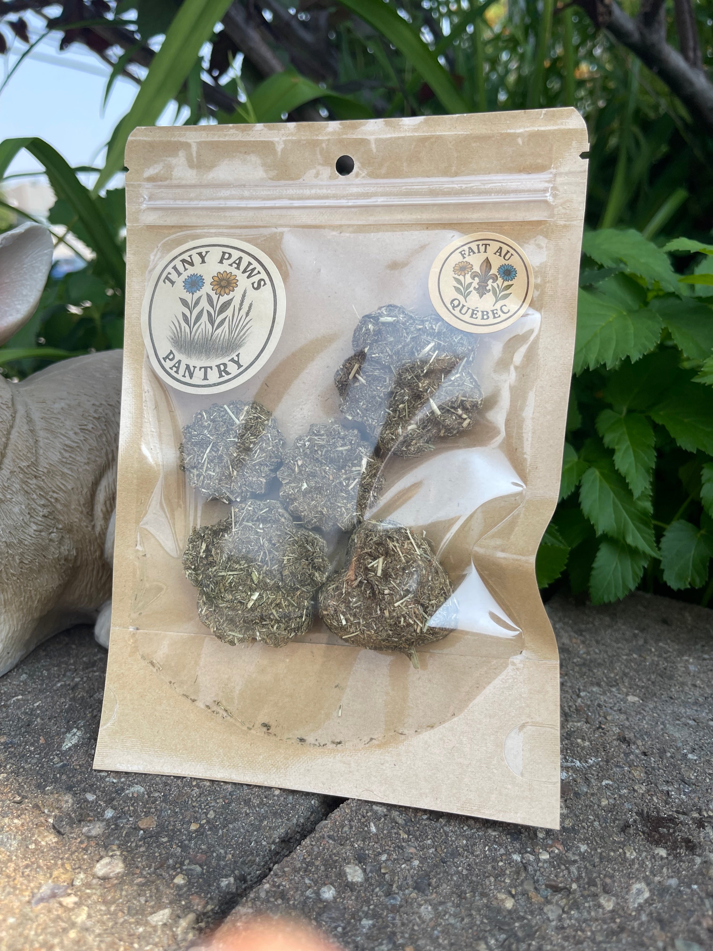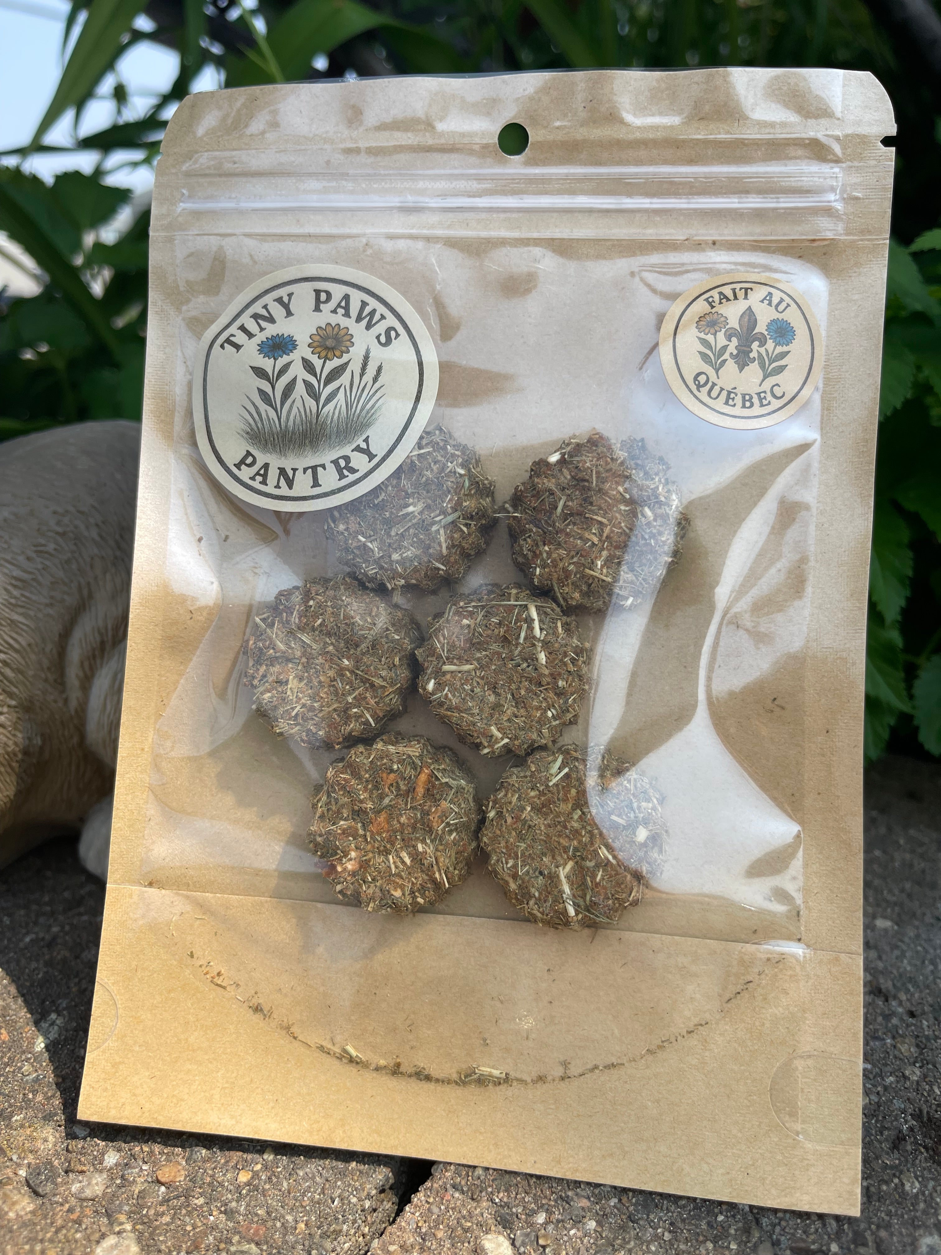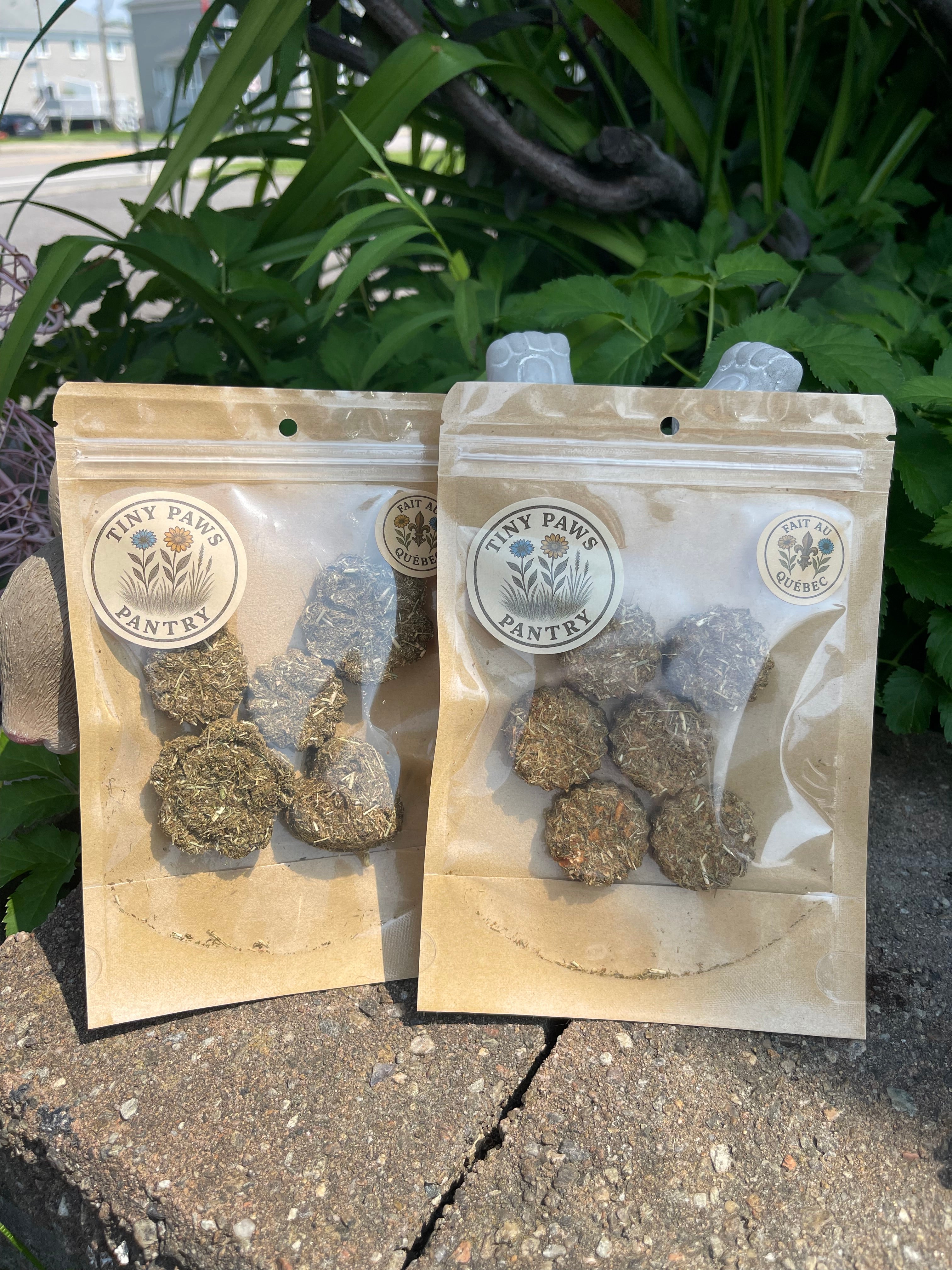 Friandises fait au Québec. Ingrédients: foin et banane ou foin et carotte