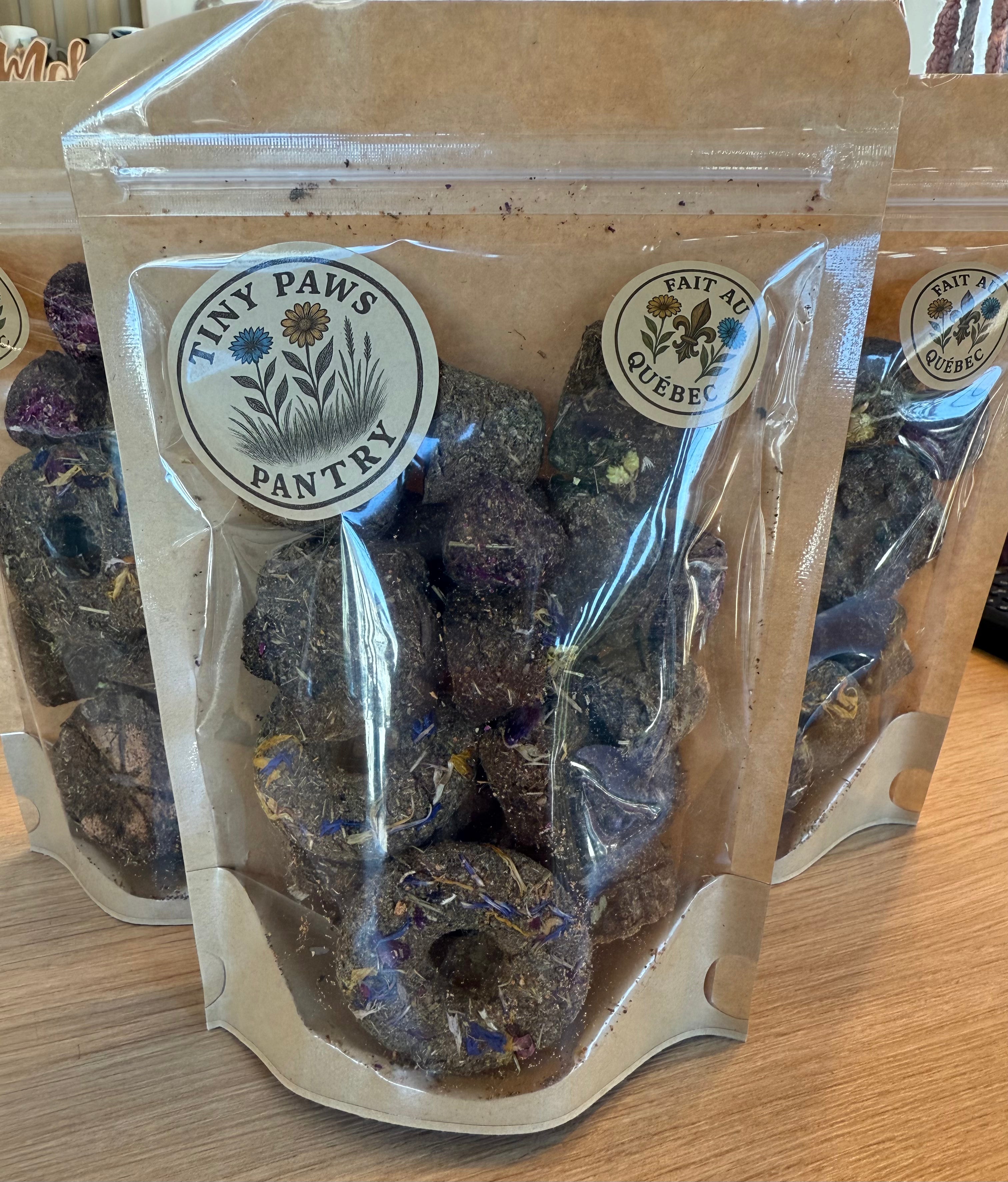Friandises naturelles fait au Québec. Ingrédients: foin, carotte, pomme, banane, roses, camomille et feuilles de pissenlits.
