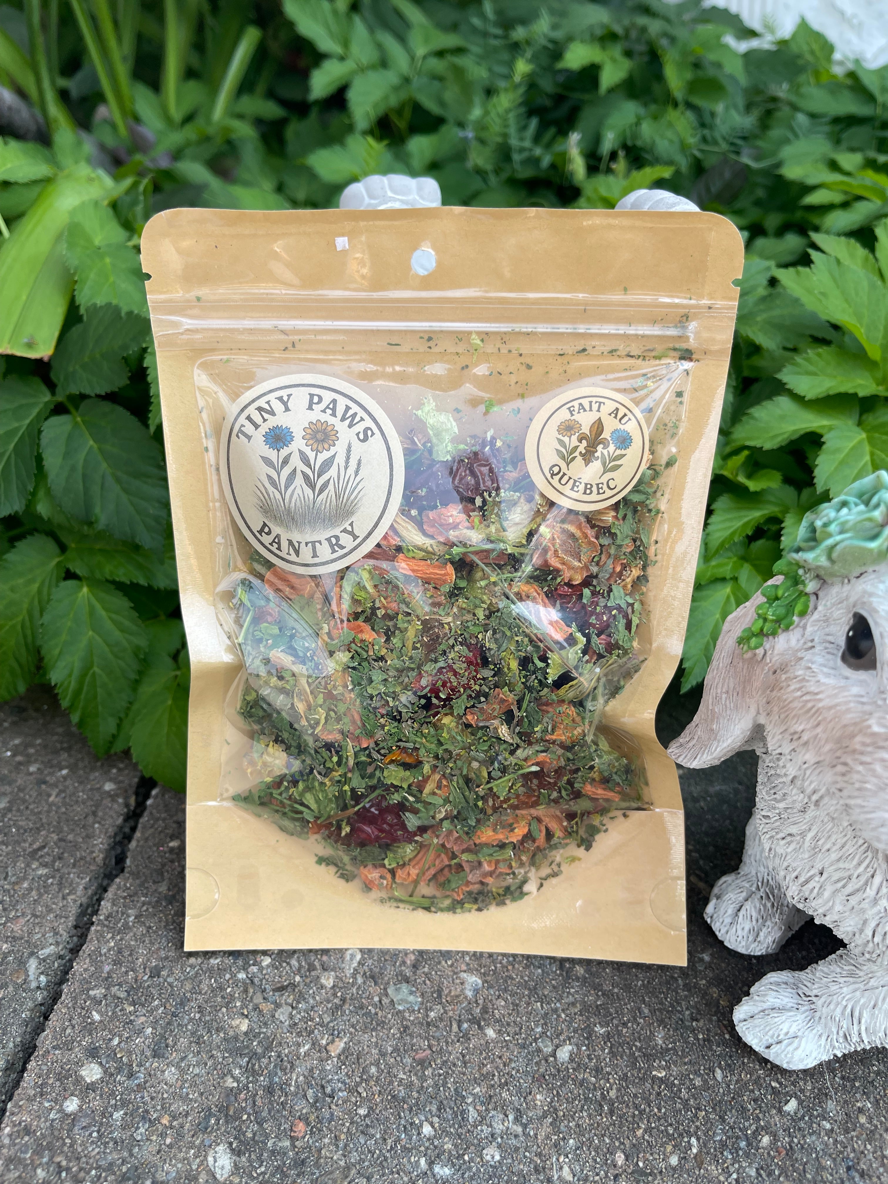 Friandises naturelles fait au Québec. Ingrédients: carotte, poivron doux, céleri, menthe, persil.