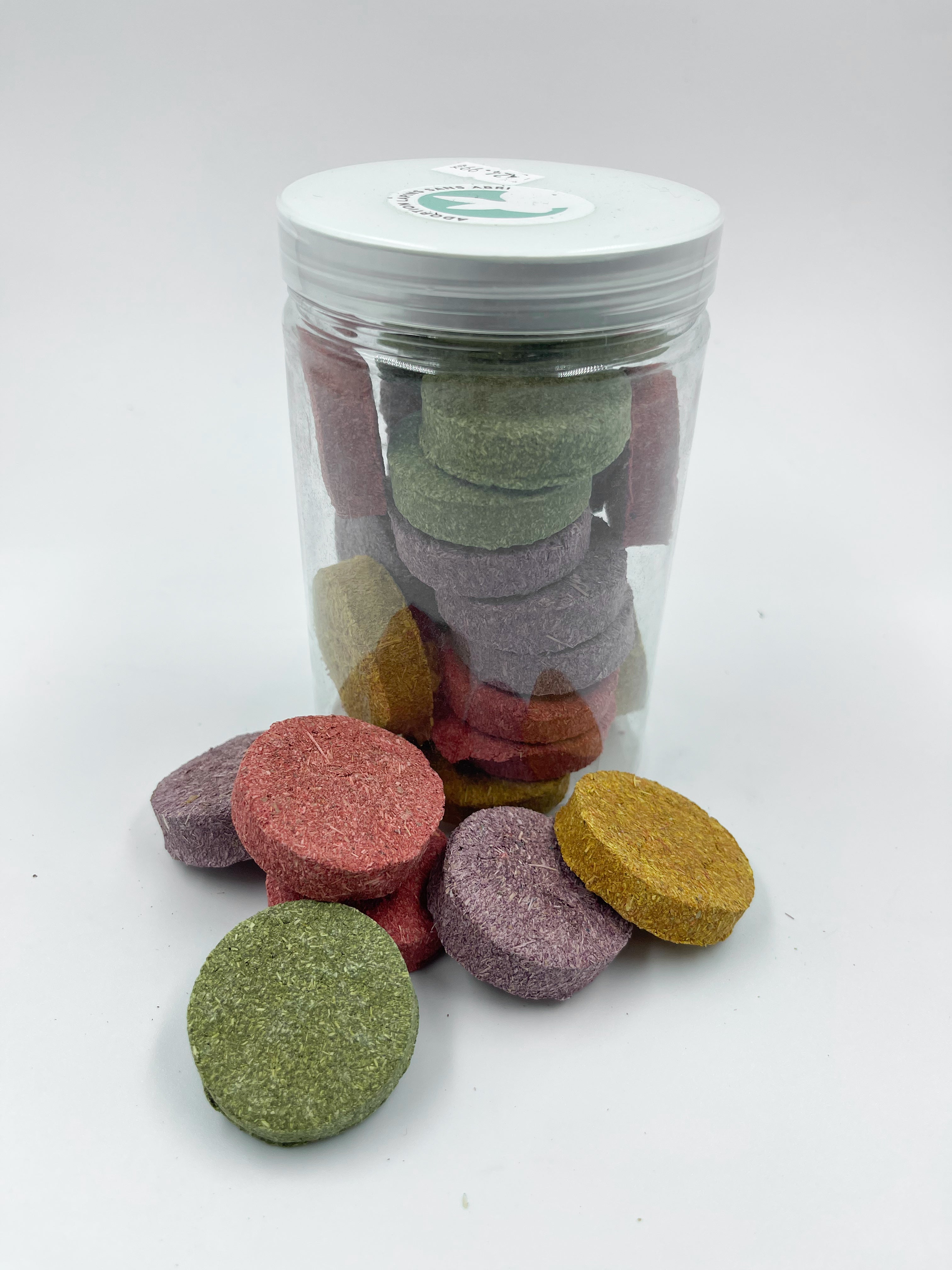 Des rondelles de fléole de près compressé en quatre saveurs soit fléole, rose, calendula et carotte. Parfait pour gâter vos lapins.