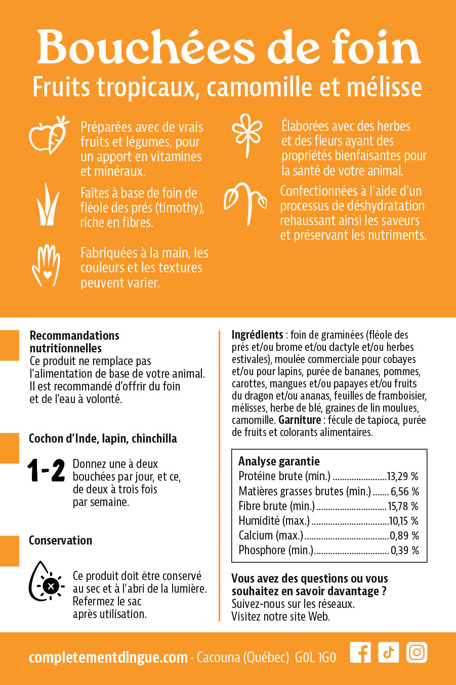 They are practical because their size is suitable for both rabbits and guinea pigs!!! They are garnished with different floral mixtures to delight the taste buds of your treasures. Made from hay, they are healthy and low in calories . They provide fiber and also contain good quality fruits and vegetables for vitamin intake. Dehydration preserves more flavors and vitamins compared to cooking in the oven. In addition, shelf life is extended if food is stored in a dry place away from light.