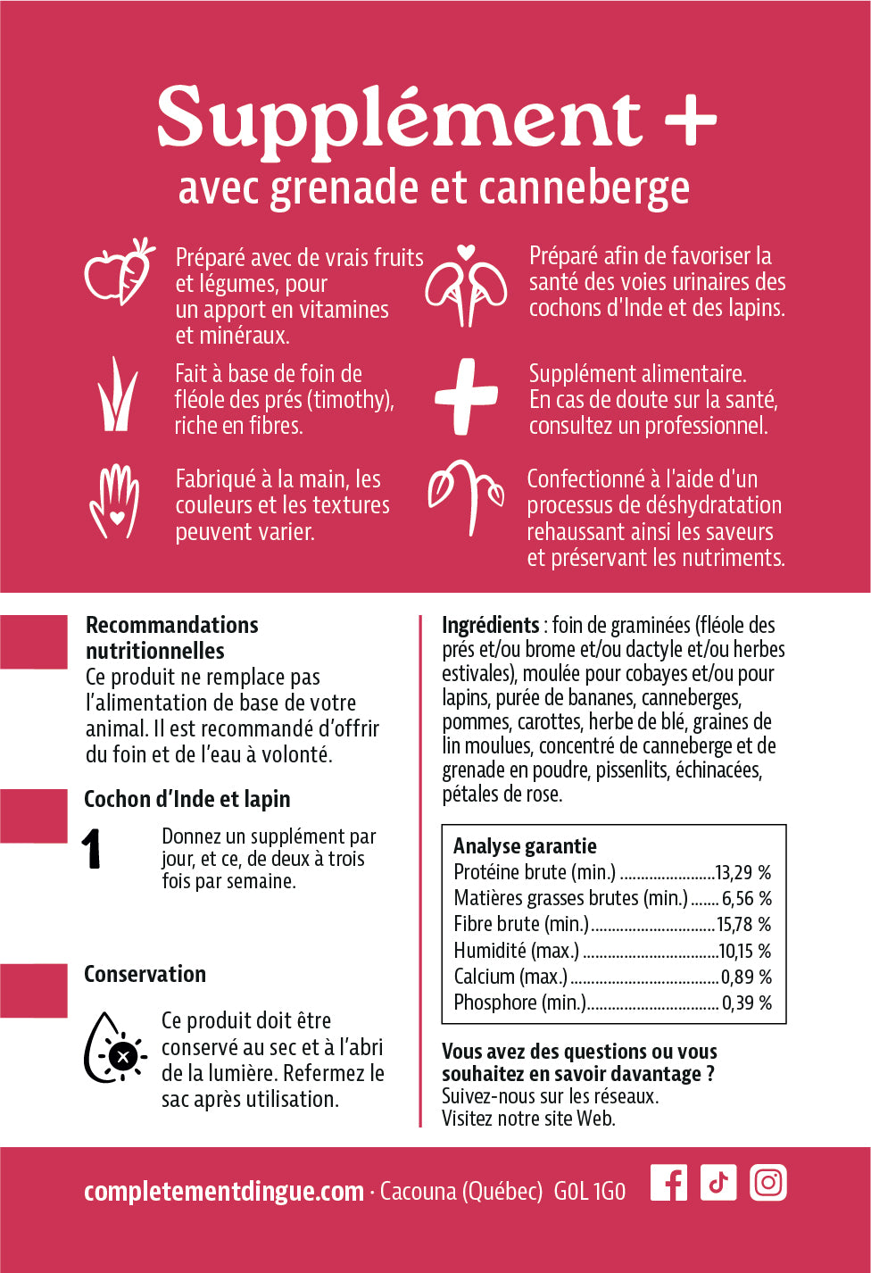Made in Quebec, in the picturesque village of Cacouna, in Bas-St-Laurent. The products come from responsible harvests, the treats are made with hay from producers in the region. Reducing waste, promoting local products and preserving the sustainable environment are among our values.