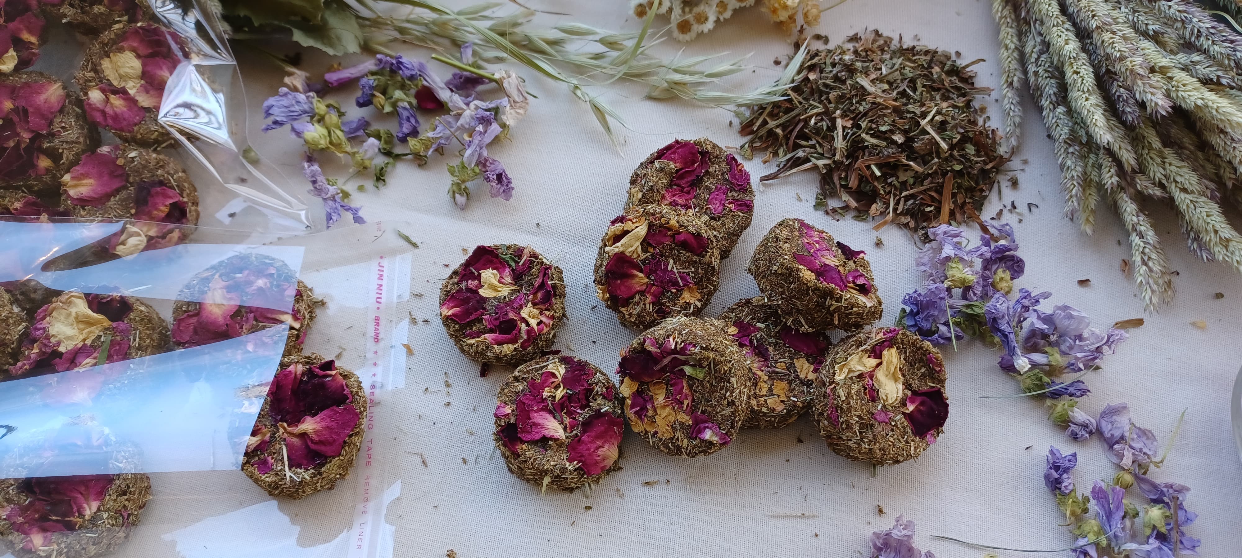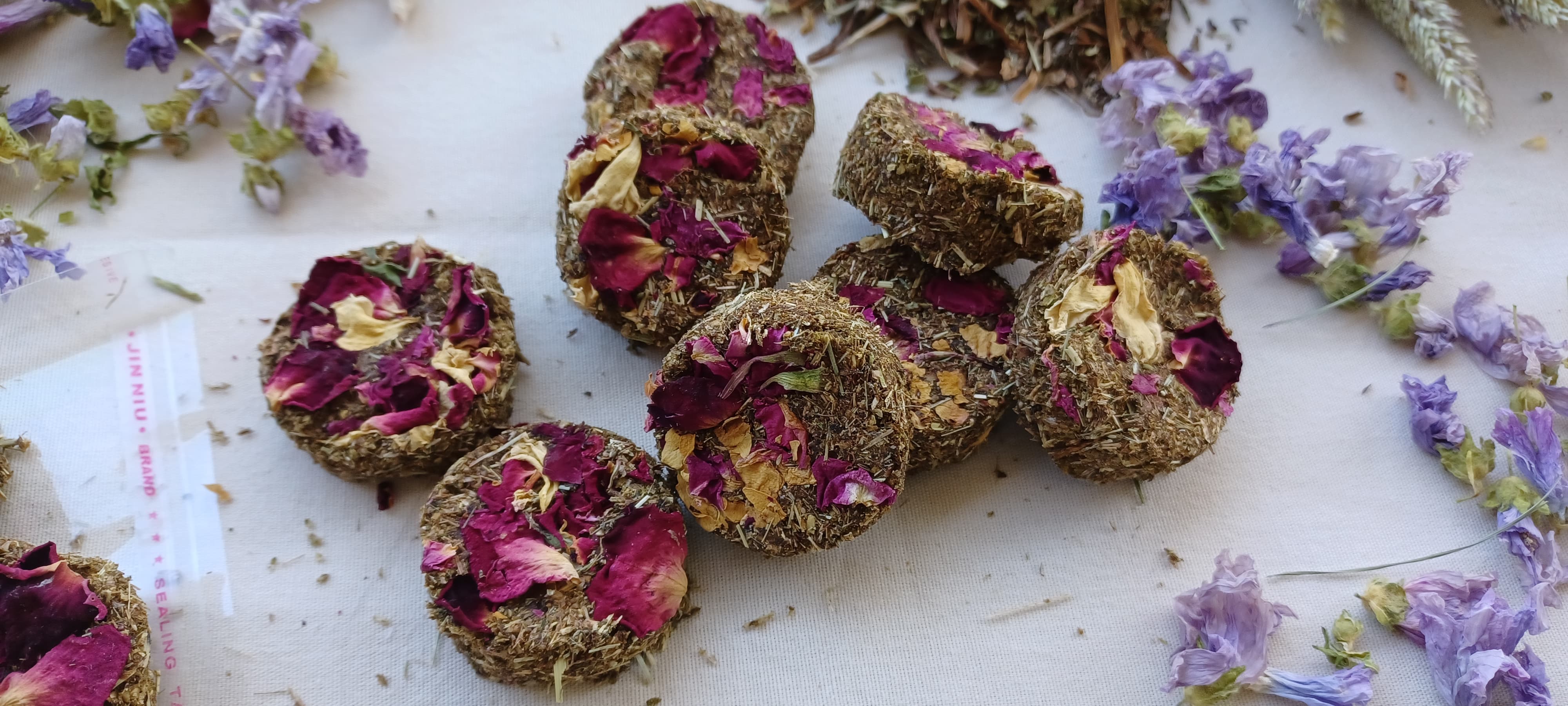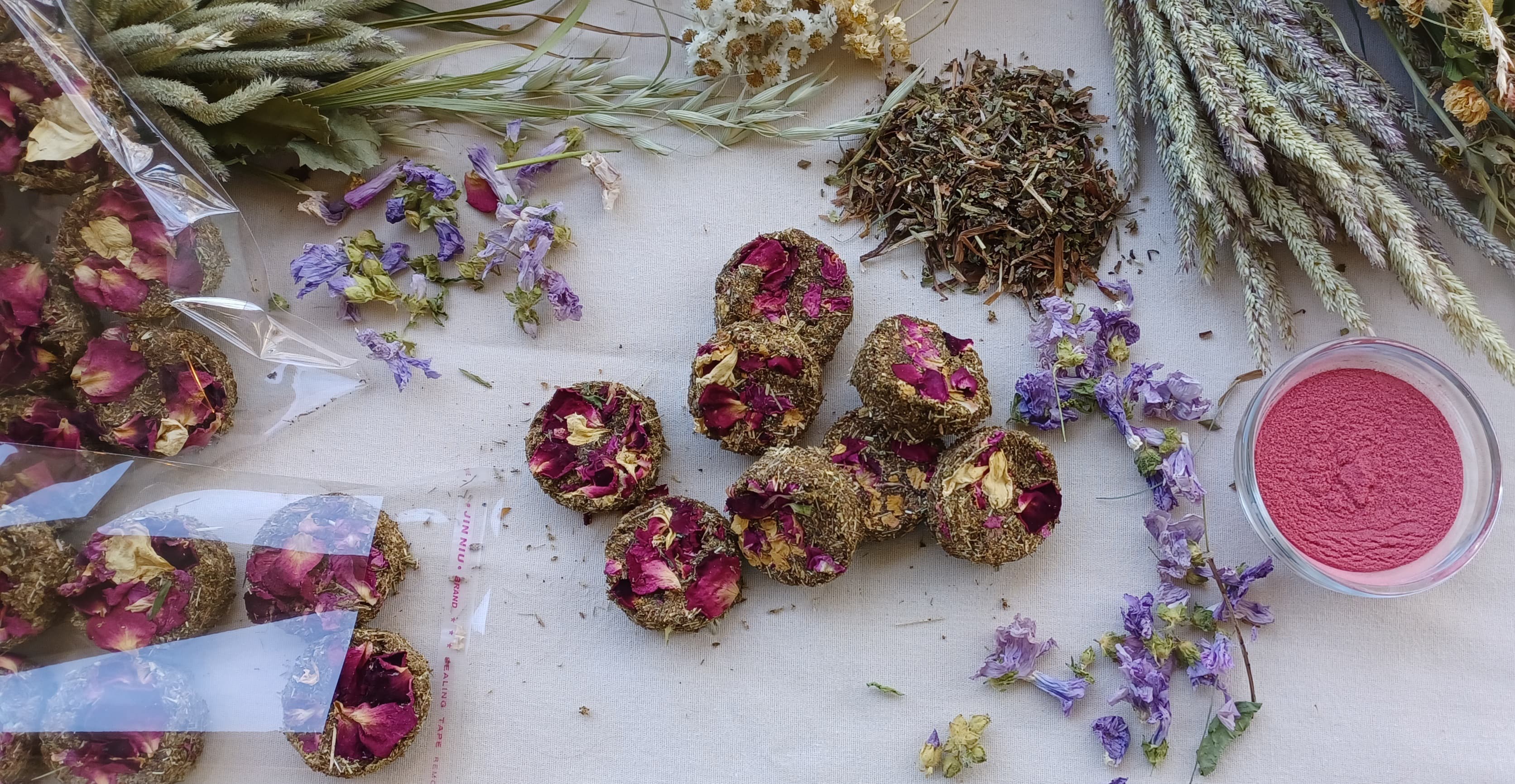 COMPOSITION: Grass hay, fruits and vegetables depending on availability at the time (may contain apples, bananas | carrots, herbs and fine herbs) commercially ground, cranberry powder, pomegranate powder. Garnished with rose petals.