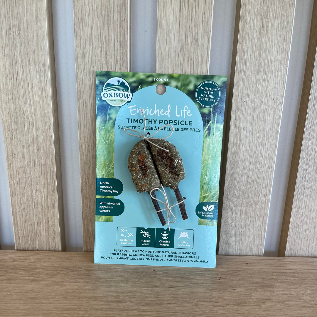 Lollipop made from timothy hay and pieces of dried apples and carrots.