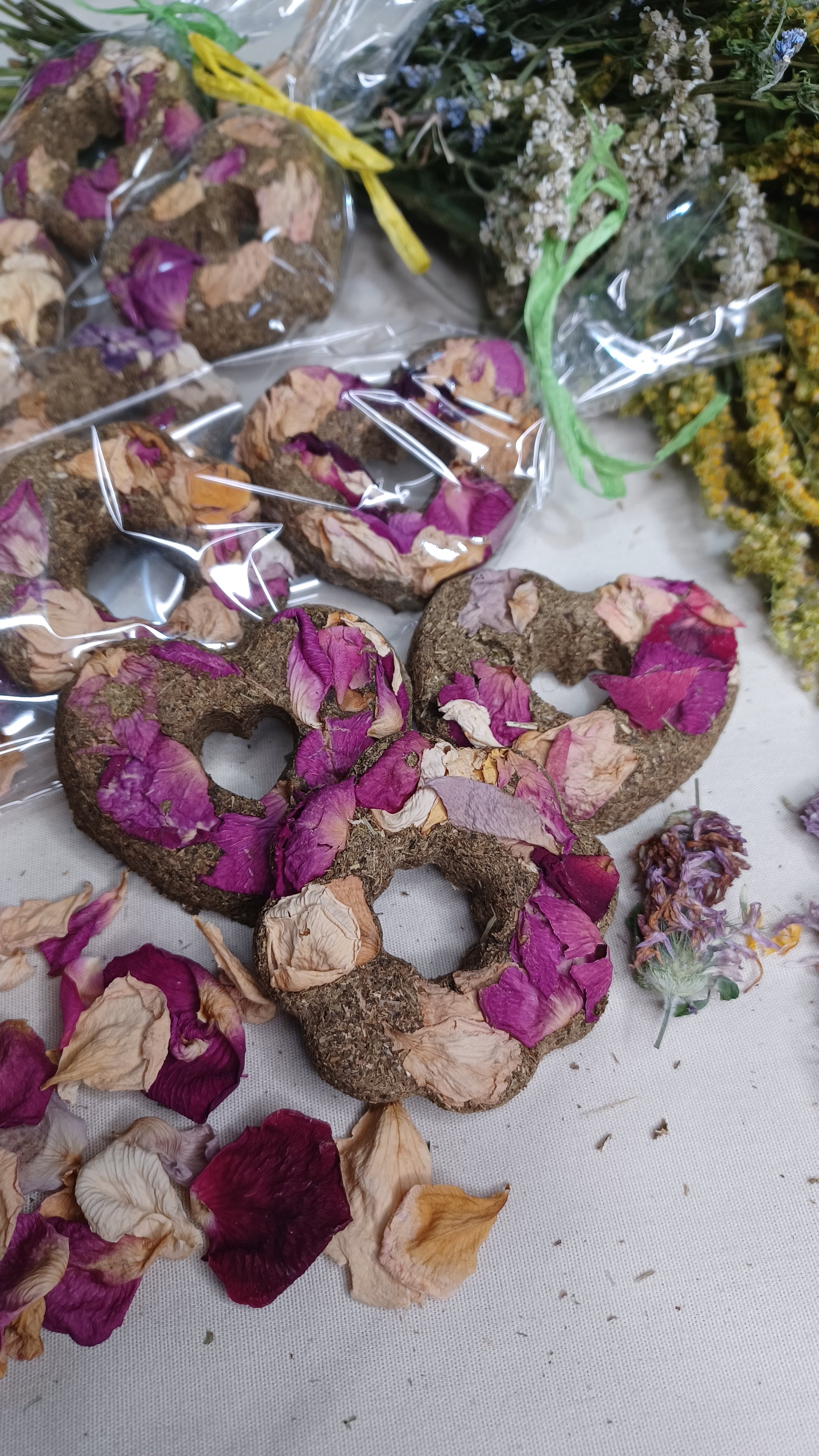 This trio of cookies is garnished with rose petals. Shaped like a heart and a flower, it will certainly appeal to rabbits and guinea pigs. It can be shared, given as a gift.