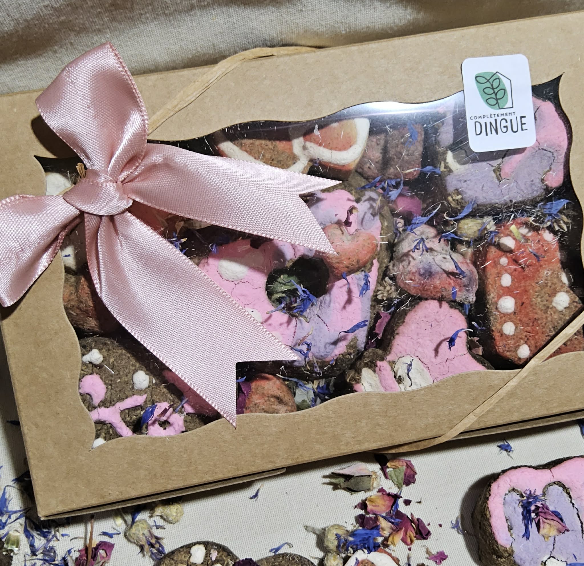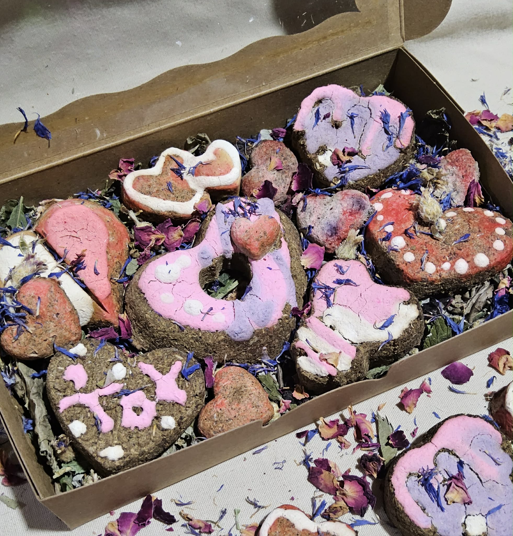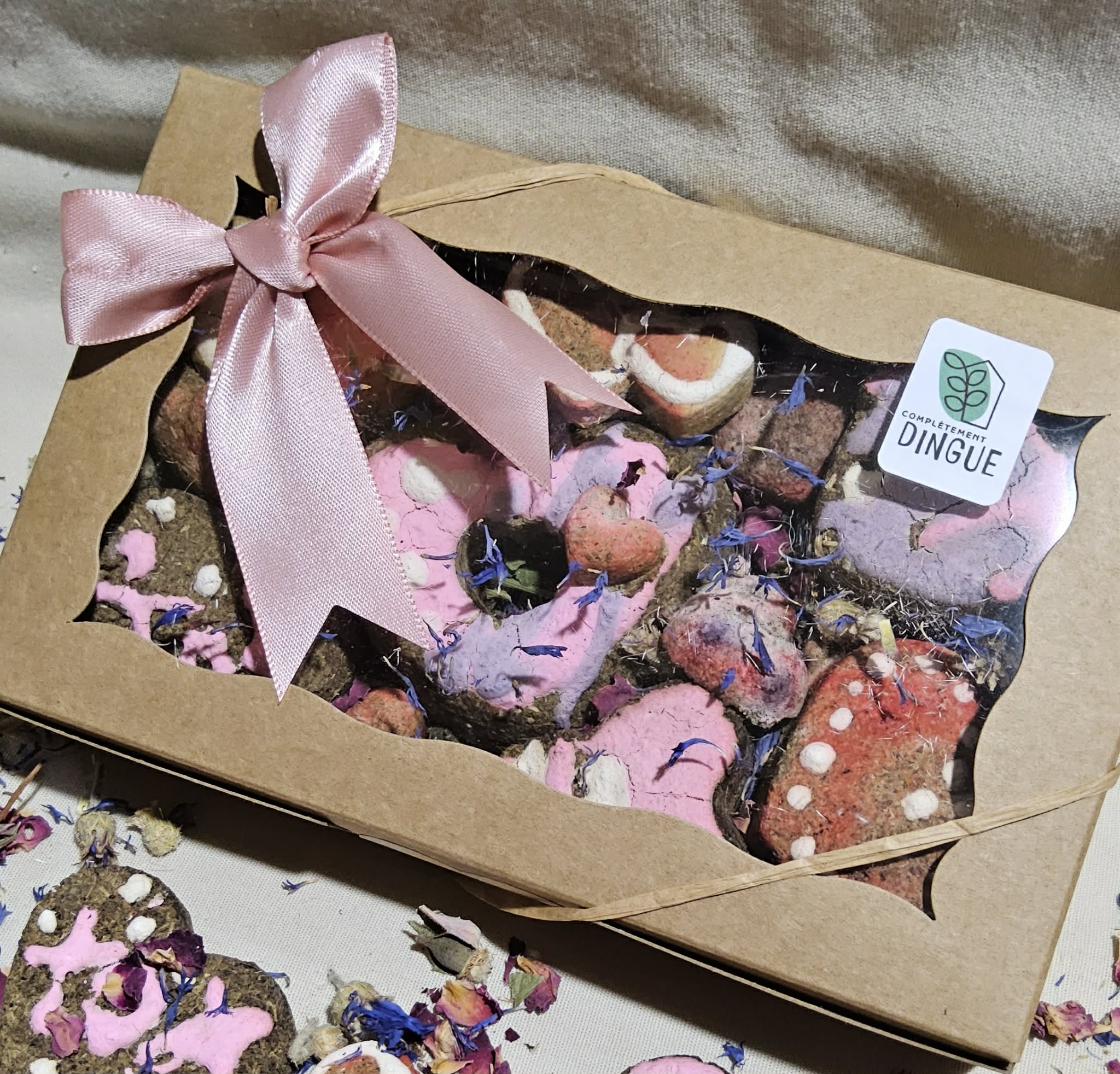 They contain 6 large heart and flower shaped treats (as well as smaller ones) weighing approximately 60 grams. They are placed on a nest of goldenrod leaves decorated with red clover flowers, picked and dried by Complètement Dingue.